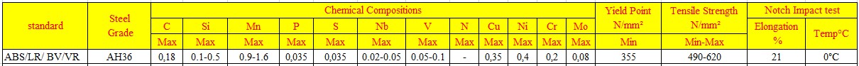 Công ty sắt thép HOÀNG Phương chuyên cung cấp các loại thép thép tấm có kích thước và Độ dày: 5mm, 6mm, 8mm, 10mm, 12mm, 14mm, 15mm, 16mm, 18mm, 20mm, 22mm, 24mm, 25mm, 26mm, 28mm, 30mm, 32mm, 34mm, 35mm, 36mm, 38mm, 40mm, 42mm, 44mm, 45mm, 46mm, 48mm, 50mm, 52mm, 54mm, 55mm, 56mm, 58mm, 60mm, 62mm, 64mm, 65mm, 66mm, 68mm, 70mm, 72mm, 74mm, 75mm, 76mm, 78mm, 80mm, 82mm, 84mm, 85mm, 86mm, 88mm, 90mm, 92mm, 94mm, 95mm, 96mm, 98mm, 100mm, 115mm, 110mm, 120mm, 130mm, 140mm, 150mm …300 ly. Tại Sắt Thép Hoàng Phương hiện mác thép AH36 đang có sẵn và chào bán.